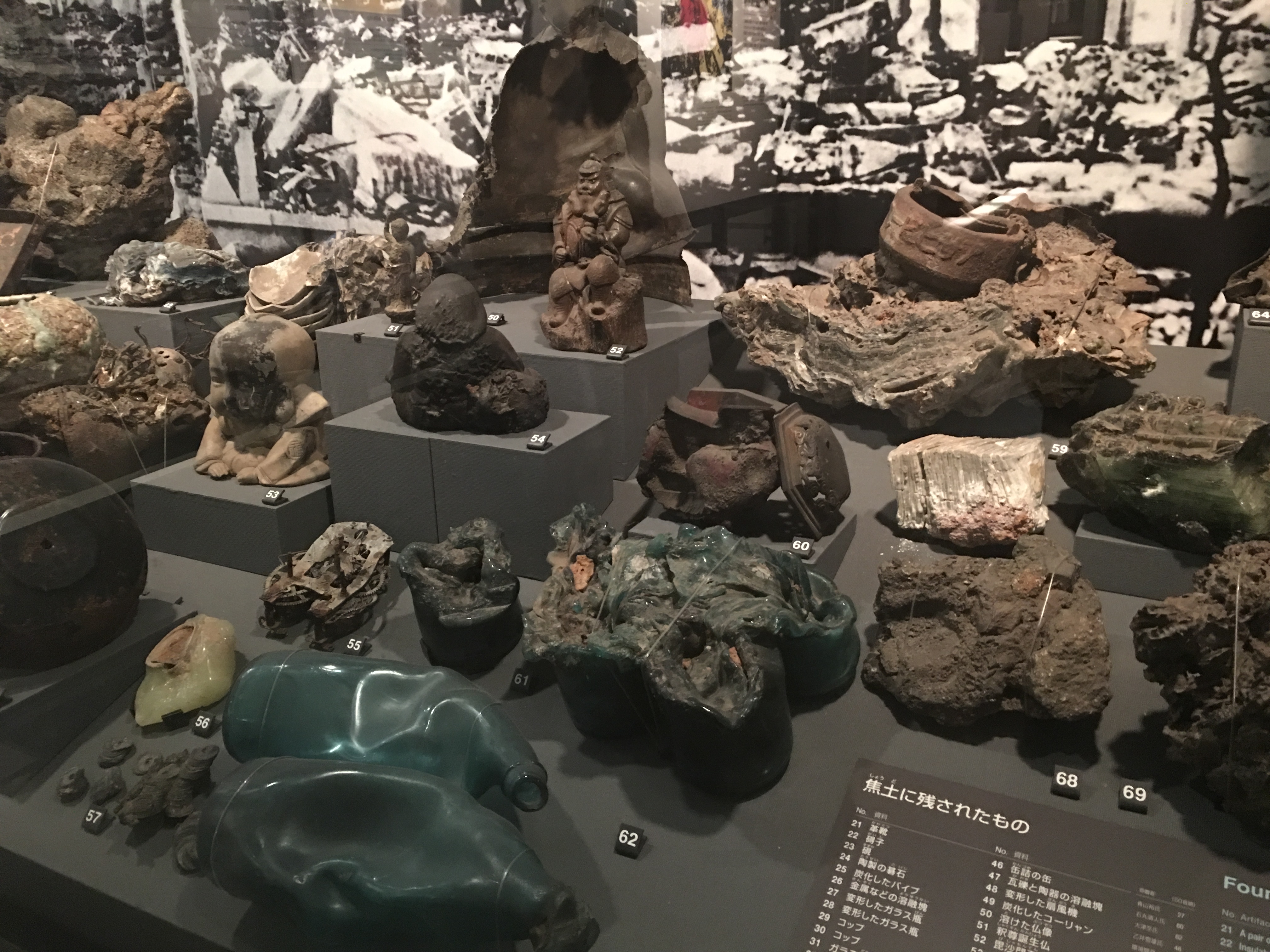 And there were dozens upon dozens upon dozens of these stories. Hundreds of these little stories, reminding us of the horrors of war. There were exhibits showing the awesome power of the bomb: plates fused together from the heat, the radiation scarring the steps of a bank, and before and after pictures.